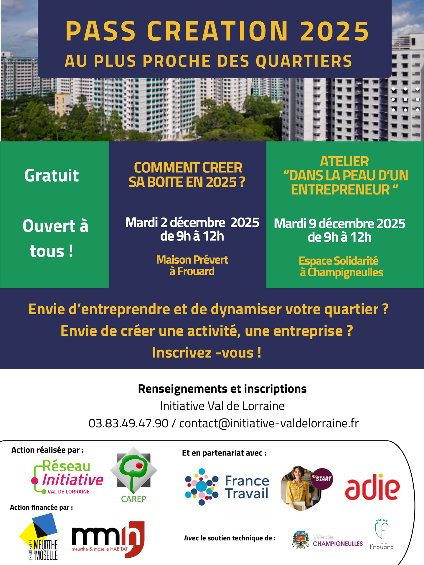 - Mardi 9 décembre 2025 : Atelier créativité « Dans la Peau d’Un Entrepreneur », animé par Initiative Val de Lorraine et la pépinière d’entreprise CAREP.