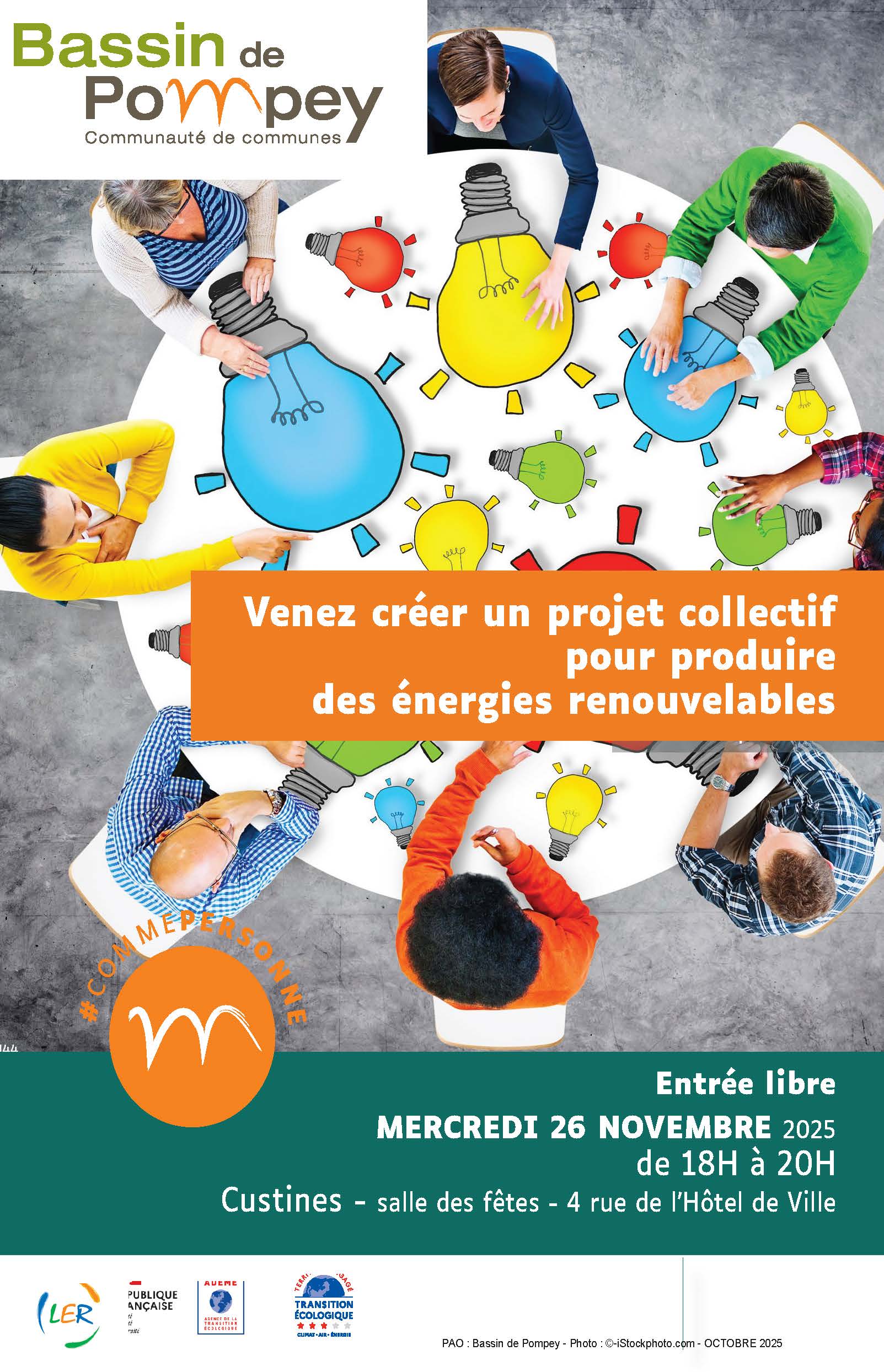 Bassin de Pompey vous invite à un atelier participatif sur la production collective d’énergies renouvelables. Venez échanger, découvrir les opportunités des projets citoyens et imaginer un projet collectif local ! mercredi 26 novembre 2025 18h – 20h Custines, Salle des fêtes, 4 rue de l’Hôtel de Ville Entrée libre