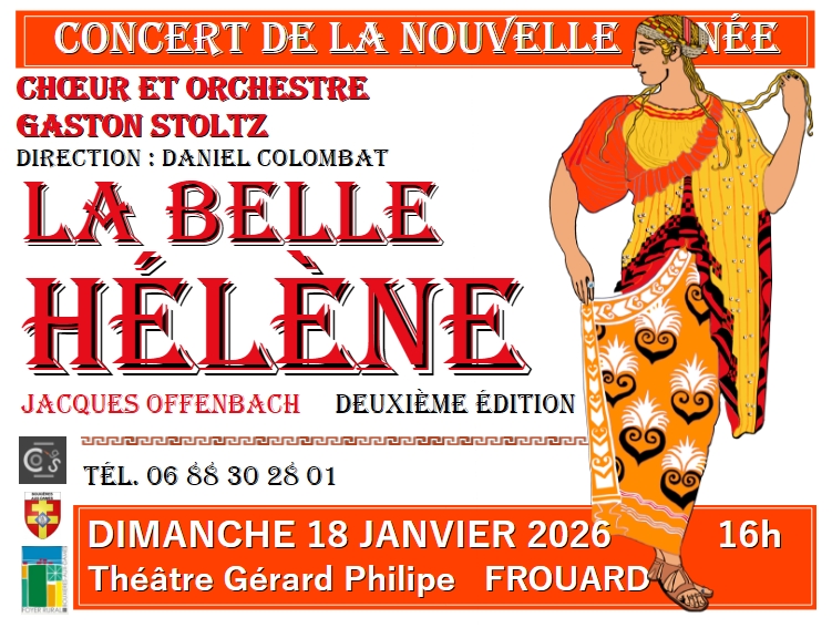 Le Chœur et Orchestre revient au Théâtre Gérard Philipe de Frouard avec La Belle Hélène, l'opéra bouffe de Jacques Offenbach. Une œuvre parodique, désopilante et enlevée qui offre au public un pur moment de bonheur avec 60 choristes, 40 musiciens et 4 solistes, placés sous la direction de Daniel COLOMBAT. Avec Sabine REVAULT D’ALLONNES soprano, Mathieu SEPTIER ténor, Emmanuel PREVOT ténor et Nils HOLLENDIECK baryton.